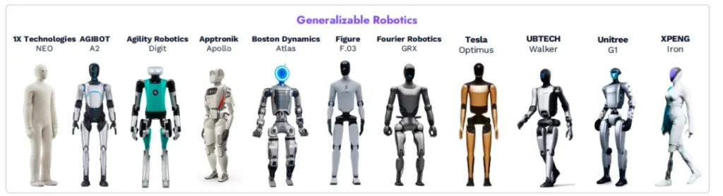 除了亚马逊等少数巨头,全球制造业的平均水平还处于“婴儿期”。随着AI能力的提升,机器人正在从“只会挥舞机械臂”进化到“能像人一样思考和行动”。ARK提到了特斯拉的Optimus,同时列出了一长串竞争对手,其中不乏中国身影,如Unitree(宇树科技)、Fourier(傅利叶智能)、AGIBOT(智元机器人)。