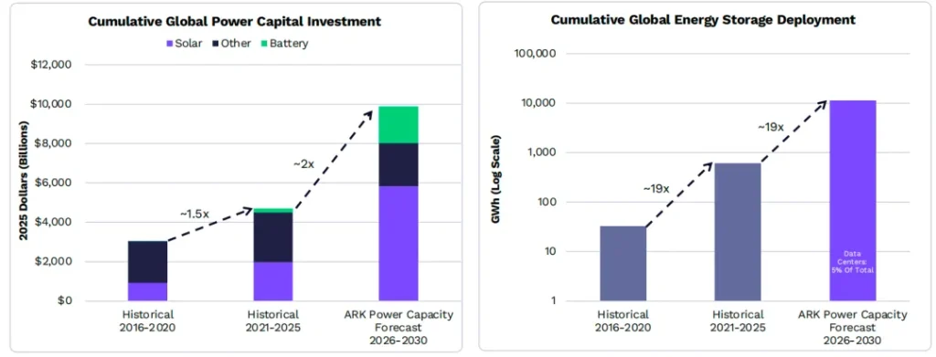 AI数据中心是吞电巨兽,这一点毋庸置疑。但ARK认为,随着太阳能和电池成本遵循“莱特定律”(产量翻倍,成本下降)持续暴跌,未来的电力将变得极其便宜。报告预测,为了支撑AI需求,全球电力投资到2030年将翻倍到10万亿美元,储能部署增长19倍。