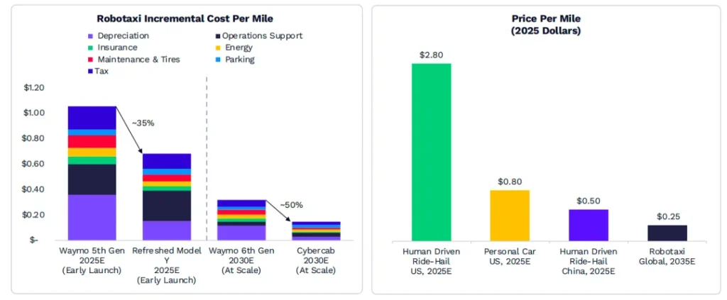 报告指出,Robotaxi(无人驾驶出租车)在旧金山等城市的份额正在飙升,成本正在逼近甚至低于人类驾驶。而在物流领域,无人机和自动配送机器人的年交付量已经超过400万次。