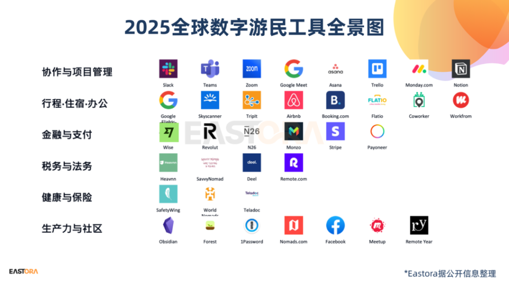 但自由不是无代价的。跨时区协作、跨境报税、多点办公、保险医疗、账户支付……他们的生活场景远比传统旅客复杂,也正是这些需求,让一整套新的软件工具浮出水面,从沟通、财务到健康、法律,一场以“数字游民”为中心的全新商业生态,正悄然成型。