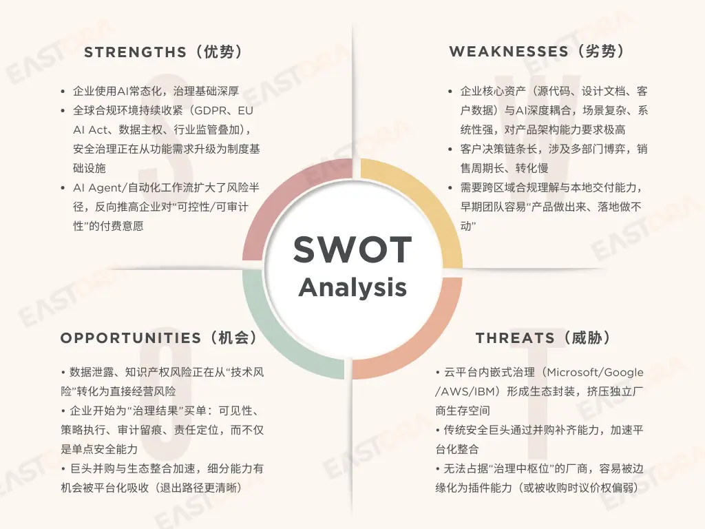 但需求成立并不意味着人人都能做成。对准备出海切入这一领域的团队而言,进入之前更需要先做一轮冷静的自我评估。下图给出一个SWOT视角的参考维度: