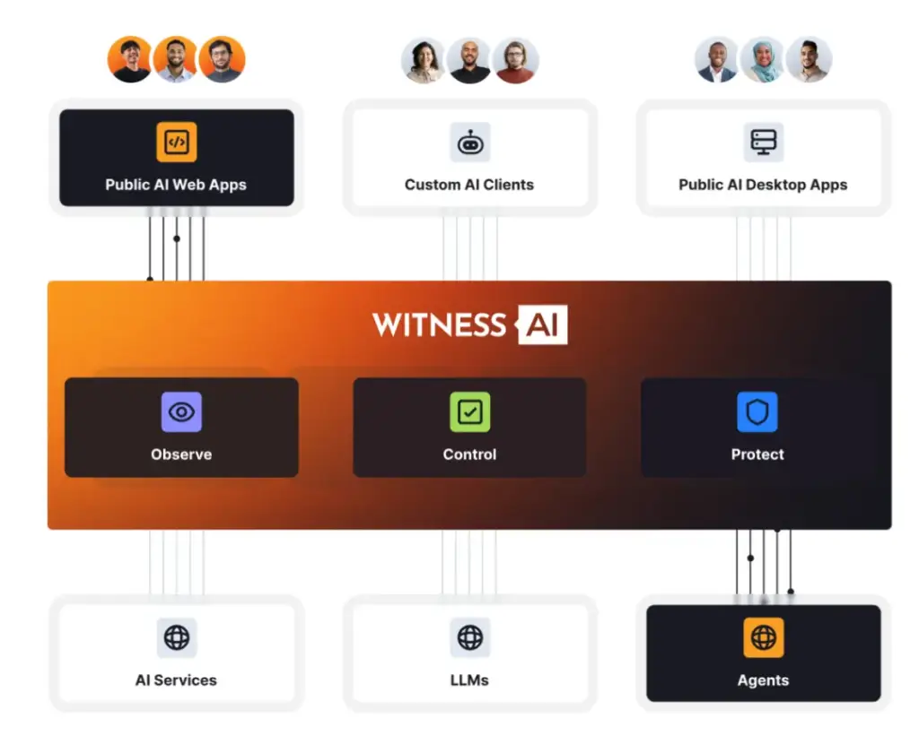 从产品架构上看,Witness AI位于企业AI体系的中枢层:向上连接公共AI应用、企业定制AI客户端与桌A应用,向下对接大模型(LLMs)、AI服务与智能代理(Agents),构建起一套横跨“人类员工+AI智能体”的统一治理体系。
