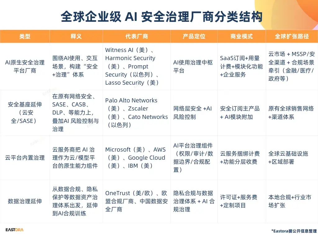 目前市场玩家大致可以分为AI原生安全治理平台厂商、安全基座延伸(云安全/SASE)、云平台内置治理、数据治理延伸四类,具体见下表: