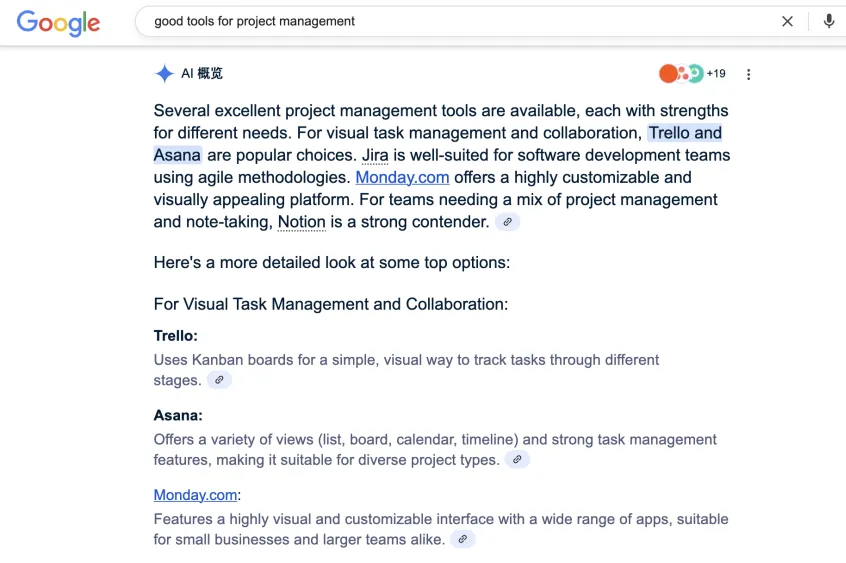 AI 给出候选清单与要点后,他切到Google,首屏就是一段能看懂也能追问的概览;接着,他只打开两三条被标注为权威来源的链接(行业报告、深度评测、真实案例)完成确认。这就是从多标签对比到“AI概览 + 少量深读”。