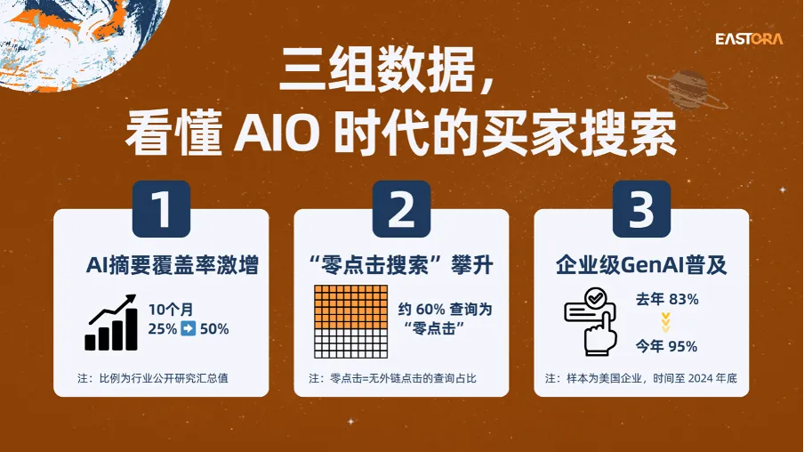 搜索结果页里,生成式 AI 的摘要越来越常见,“零点击”随之上升;与此同时,企业端对GenAI 的采用跃升,让买方更习惯把调研的第一步交给机器完成——先要答案,再挑证据。