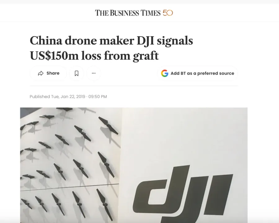 The Business Times关于大疆内部贪腐事件的报道截图