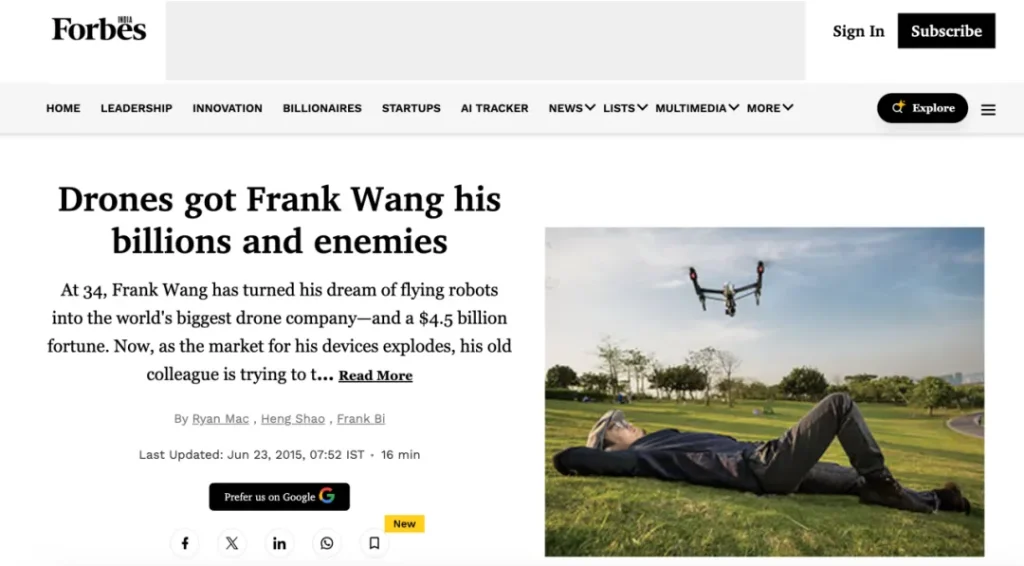 福布斯报道截图,2015年发布的第三篇文章,标题为《无人机为汪滔带来数十亿身家,也带来了敌人》