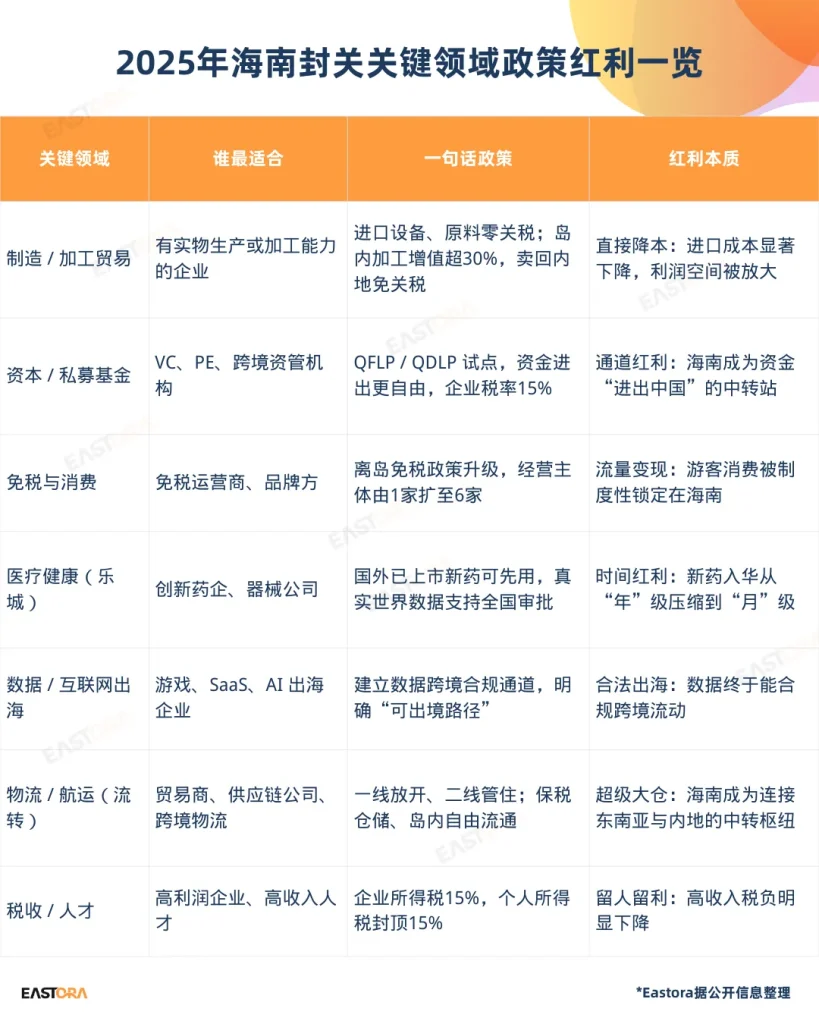 对于企业来说,海南现在就是一个“特区中的特区”。为了让大家一眼看懂这个复杂的政策迷宫,我们梳理了一份封关后的核心政策红利表。看懂它,无疑将拥有一份企业省钱、赚钱的“作弊代码”。