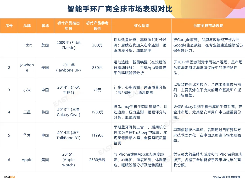 数据背后,是少数几家科技巨头对市场的绝对主导,仅苹果一家,就占据了17.2%的市场份额(GMI,2024)。笔者以智能手环为例,梳理目前主流的品牌厂商如下: