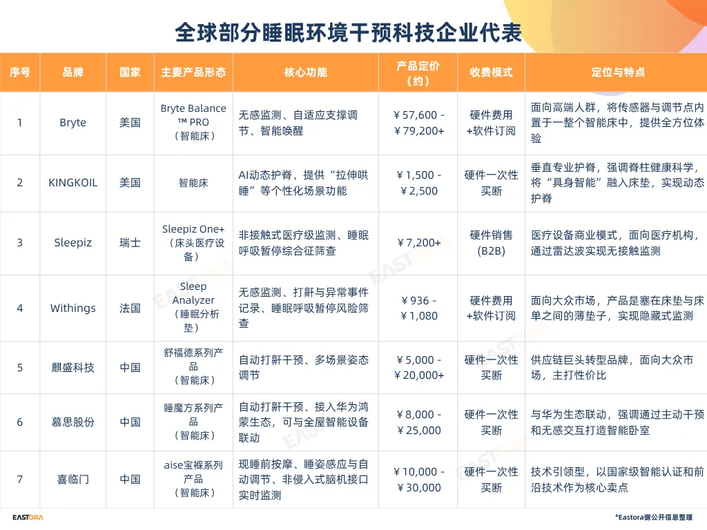 意识到“睡眠是人与环境互动结果”的企业远不止Eight Sleep一家,它们大多通过“无感化监测→临床级诊断分析→主动改变睡眠物理参数”的路径重塑用户睡眠环境,但对“干预”的形态进行了多元化的探索。下表列举部分代表品牌: